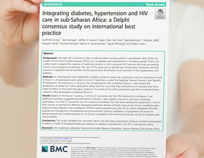 INTE-AFRICA researchers have published “Integrating diabetes, hypertension and HIV care in sub-Saharan Africa: a Delphi consensus study on international best practice †in BMC Health Services Research. The aim of the study was to identify key components, outcomes, and best practice in integrated service provision for the prevention, identification and treatment of HIV, hypertension and diabetes.